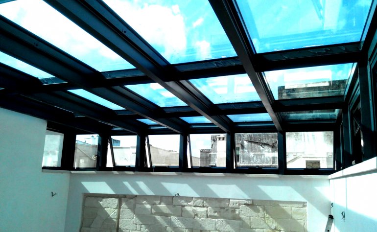 Copertura vetrata con profili Metra Sky facciata continua in alluminio con vetro temperato a controllo solare antisfondamento, completa di otto aperture a sporgere con motore elettrico