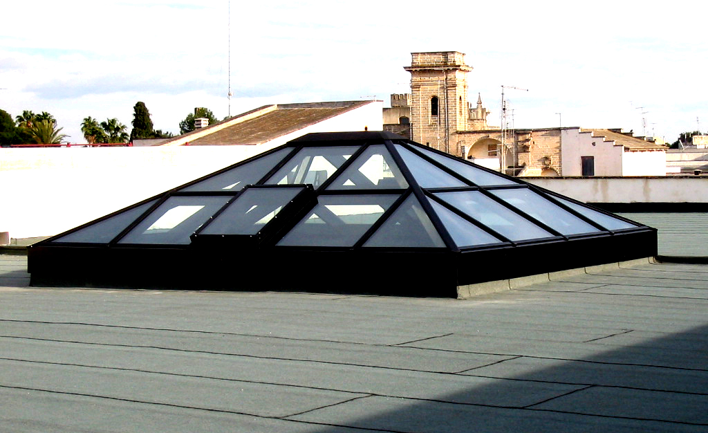 Lucernario piramidale realizzato con profilati in alluminio Metra facciata continua Poliedra Sky 50 con aperture motorizzate