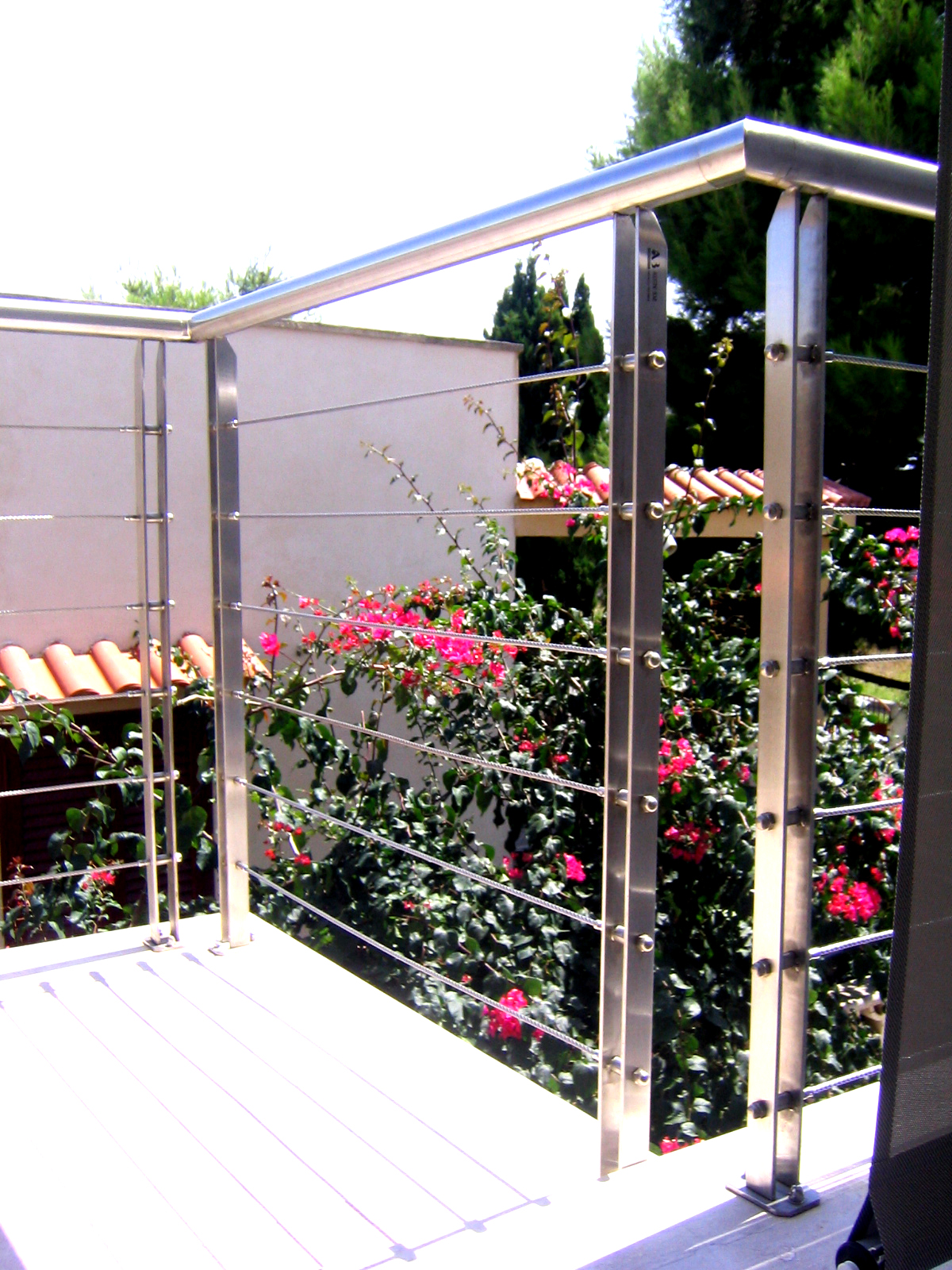 Ringhiera con montanti in piatto, corrimano in tubo e cavi in acciaio inox AISI 316 lucido