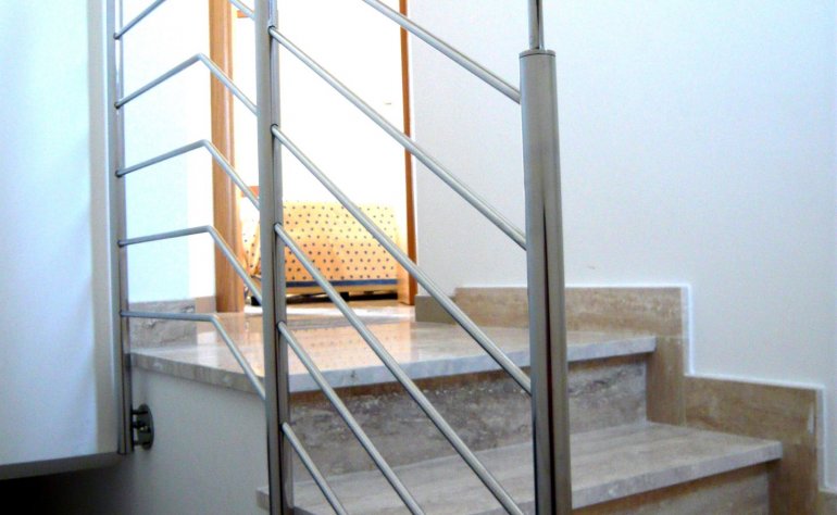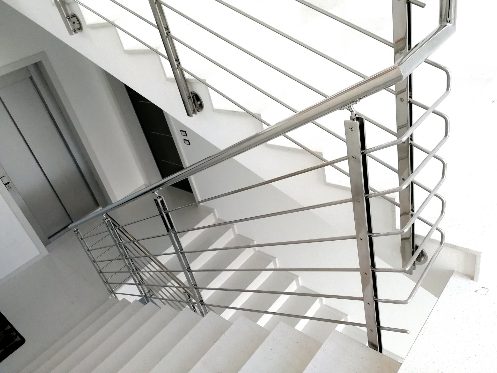 Ringhiere scala interna con corrimano, tondini orizzontali e montanti in acciaio inox AISI 304 lucido