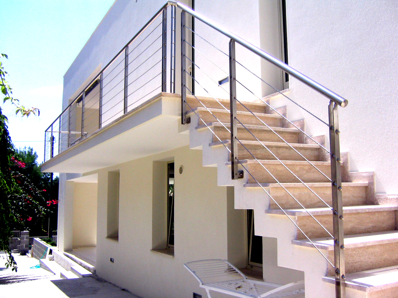 Ringhiera balconi e scala con montanti in profilo piatto doppio, corrimano in tubo circolare e cavi in acciaio AISI 316 lucido