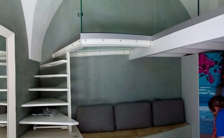 Scala interna e soppalco realizzati in ferro e completi di verniciatura a forno, con ringhiere di protezione in vetro 8+8 temperato